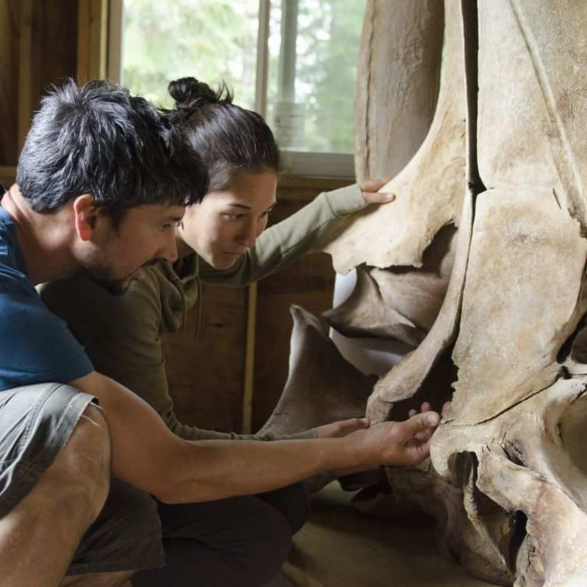 I have quite a background in animal behaviour and I do quite a bit of marine mammal fieldwork out on boats, watching whales swim around and do what they do. And so, we integrate the latest scientific research on whale behaviour and movements, we use drone footage and underwater photography of whales swimming around. And we take all of that knowledge and come up with a story that we want to tell with the bones.