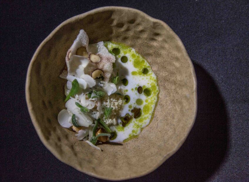 To serve: Place 1 tsp of lemon myrtle emulsion onto each plate. Cover with a quarter of the macadamia nut couscous. Add 1tbsp of roasted macadamia nuts. Now add the shaved youlk and shaved macadamia nuts. Place sea celery stalks on top.